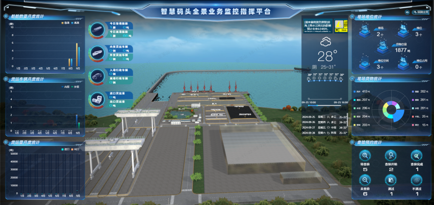 航通智能主要承擔(dān)信息化系統(tǒng)包括海關(guān)、邊檢、海事信息化系統(tǒng)相應(yīng)軟硬件設(shè)施設(shè)備,以及符合海關(guān)監(jiān)管要求和前詹作業(yè)區(qū)通用碼頭業(yè)務(wù)發(fā)展需要的聯(lián)網(wǎng)監(jiān)管平臺及配套系統(tǒng)。公司對標(biāo)全國一流碼頭作業(yè)區(qū)口岸基礎(chǔ)設(shè)施信息化建設(shè)標(biāo)準(zhǔn),充分運用物聯(lián)網(wǎng)、大數(shù)據(jù)、人工智能、數(shù)字孿生、3D模型等前沿科技,并引入智慧碼頭全景業(yè)務(wù)指揮監(jiān)控平臺,通過平臺與碼頭作業(yè)系統(tǒng)對接,抽取碼頭內(nèi)外貿(mào)貨物的作業(yè)數(shù)據(jù),結(jié)合可視化智能大數(shù)據(jù)展示功能,實現(xiàn)獲取船舶抵錨、靠泊離港作業(yè)動態(tài),并對內(nèi)外貿(mào)貨物進(jìn)出卡口、堆場存取、裝卸船等實時、動態(tài)管理和全程監(jiān)控,全面提升碼頭作業(yè)全過程可視化監(jiān)管水平和查驗全流程智能化管理。