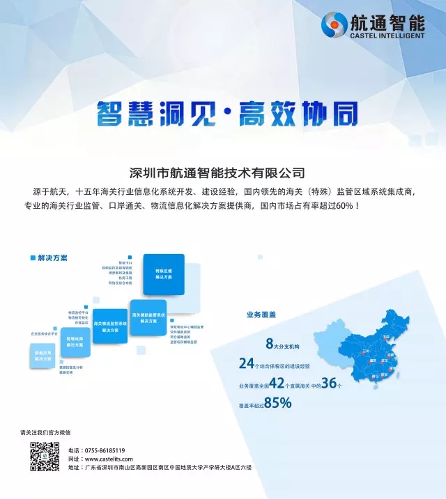 航通智能是國家級高新技術(shù)企業(yè)和雙軟認(rèn)證企業(yè),并獲得CMMI3資質(zhì)認(rèn)證。歷程十五載,航通智能已于海關(guān)行業(yè)監(jiān)管、口岸通關(guān)、保稅物流、加工貿(mào)易、物流信息化應(yīng)用集成領(lǐng)域在全國建設(shè)了數(shù)百個(gè)特殊監(jiān)管區(qū)與和監(jiān)管場所信息化系統(tǒng)。其中涉及云卡口、大數(shù)據(jù)風(fēng)險(xiǎn)分析、北斗/GPS監(jiān)控應(yīng)用、RFID射頻識(shí)別、移動(dòng)智能終端等應(yīng)用技術(shù)。業(yè)務(wù)覆蓋全國42個(gè)直屬海關(guān)中的36個(gè),關(guān)區(qū)覆蓋率超過85%,核心業(yè)務(wù)市場占有突破60%。